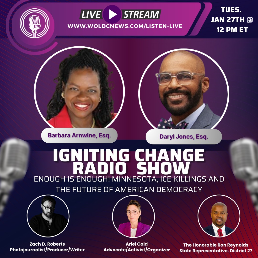 Hi Igniters For Change! The Igniting Change Radio Show on Tuesday, January 27th, 2026, from 12:00 PM – 1:00 PM Eastern Time, entitled “Enough Is Enough! Minnesota, ICE Killings and The Future of American Democracy”, will be live with Radio Show Co-Hosts and Transformative Justice Coalition (TJC) Co-Leaders Attorneys Barbara Arnwine, Esq. and Daryl Jones, Esq. and will feature special guests The Honorable Representative Ron Reynolds, Rabbi Ariel Gold, and Zack Roberts. Igniting Change shares its condolences to the family of Alex Pretti and the people of Minneapolis who have been suffering this occupation.