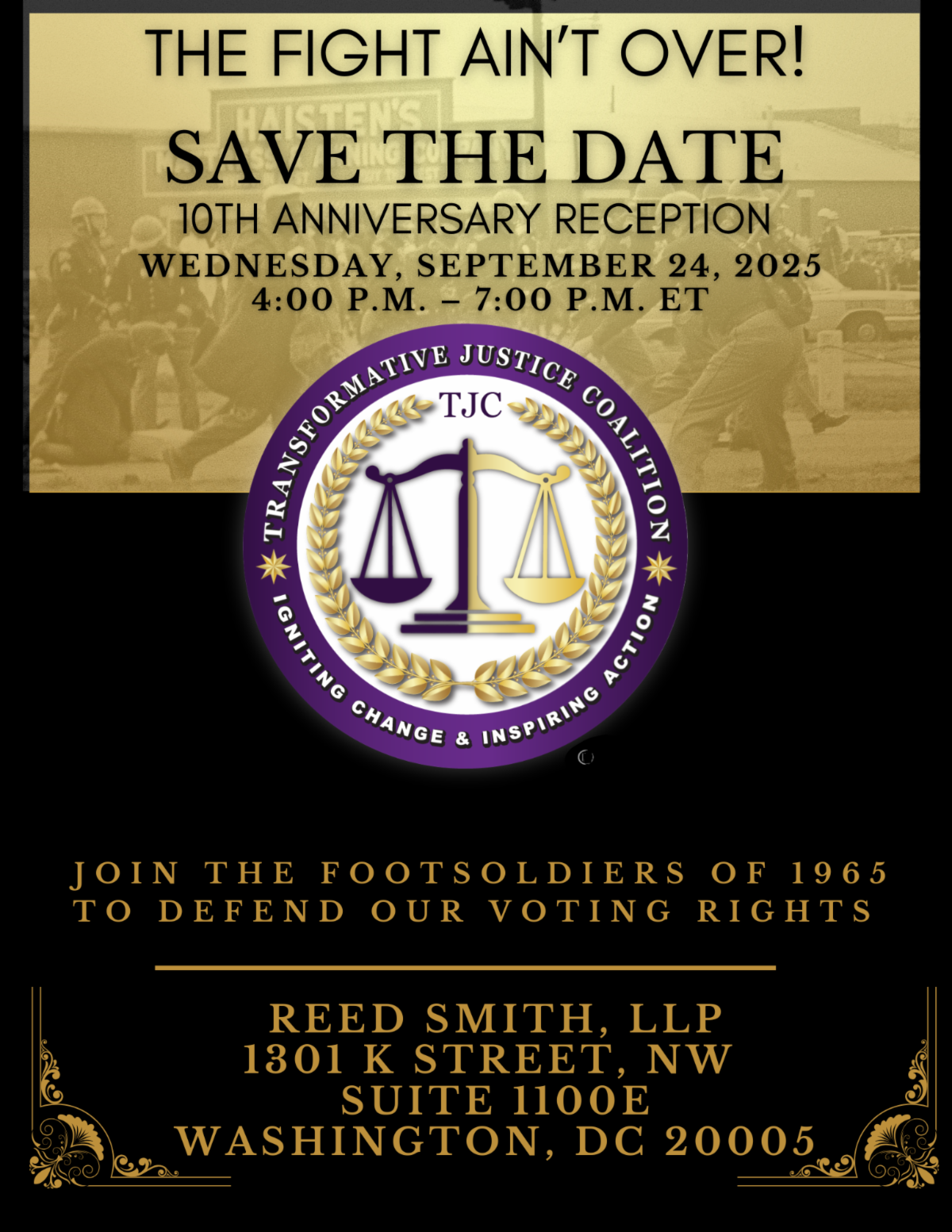 Reed Smith LLP 1301 K Street, NW, Washington, DC, WA, United StatesMARK YOUR CALENDERS NOW! Join Us For The 10th Anniversary Of The Transformative Justice Coalition! The Fight Aint Over Reception! “The Battle for the Ballot Continues: Original Foot Soldiers To The Forefront Reception” Wednesday, September 24, 2025, 4:00 pm - 7:00 pm ET. Barbara Arnwine, Esq - Founder/President Daryl Jones, Esq - Board Chair Transformative Justice […]