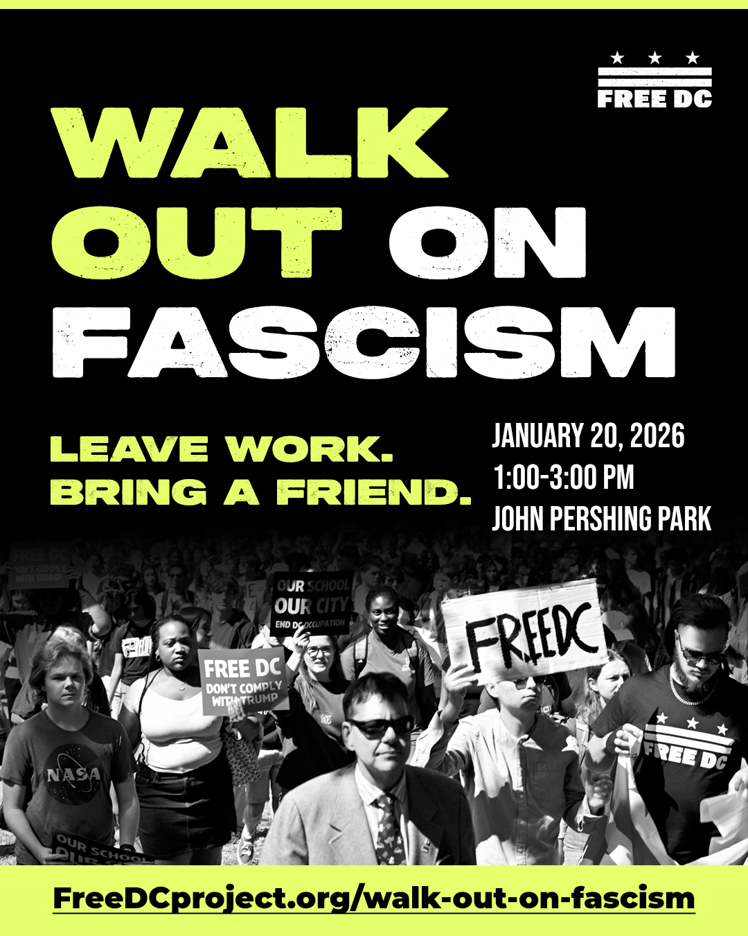 Start: Tuesday, January 20, 2026•01:00 PM End: Tuesday, January 20, 2026•03:00 PM Location: Pershing Park • 14th Street NW & Pennsylvania Avenue NW, Washington, DC 20002 US Host Contact Info: team@freedcproject.org” Attend this event: https://freedcproject.org/event-list/walkout January 20, 2026 will mark one year of this fascist regime as well as one year of Free DC's organizing to protect our […]